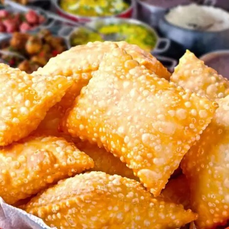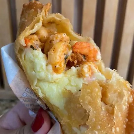 Pastel de camarão bem recheado, temperado no ponto certo, envolvido em uma massa crocante.