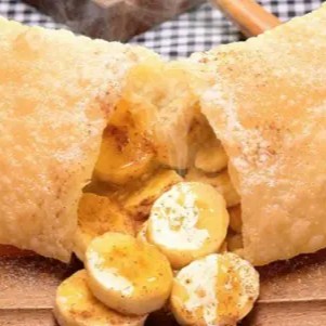 Pastel de banana com creme de avelã bem recheado, com uma massa crocante e douradinha.