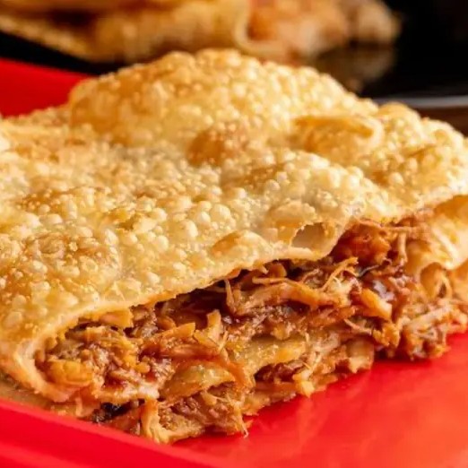 PASTEL DE PERNIL COM MOLHO BARBECUE BEM RECHEADO, TEMPERADO NO PONTO CERTO, ENVOLVIDO EM UMA MASSA CROCANTE E DOURADINHA!