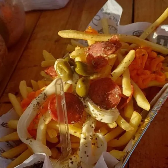 Batata frita tamanho G, crocantes e sequinha, acompanhadas com cheddar, catupiry e uma deliciosa calabresa