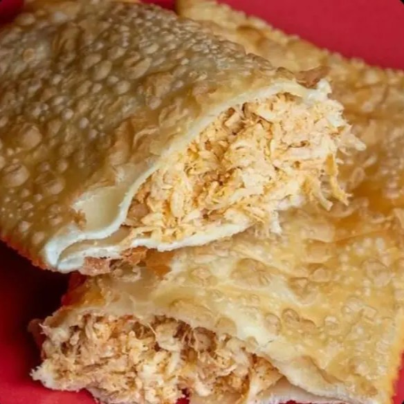 PASTEL DE FRANGO DESFIADO BEM RECHEADO, TEMPERADO NO PONTO CERTO, ENVOLVIDO EM UMA MASSA CROCANTE E DOURADINHA!