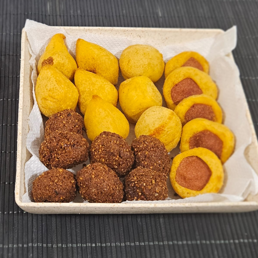 Kibe, bolinha de queijo, queijo e presunto, coxinha e enroladinho de salsicha.