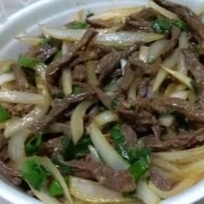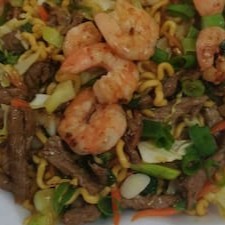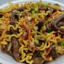 Macarrão, carne, repolho, cenoura, brócolis, cebolinha e molho shoyo.