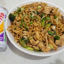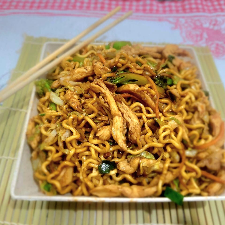 Macarrão, frango, repolho, cenoura, brócolis, cebolinha e molho shoyo.