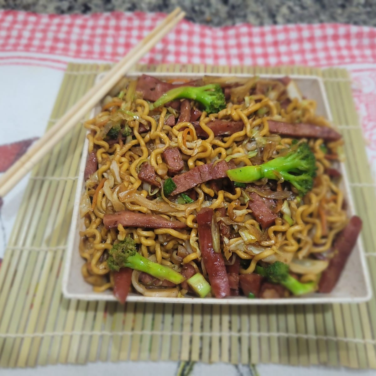 Macarrão, calabresa, repolho, cenoura, brócolis, cebolinha e molho shoyo.