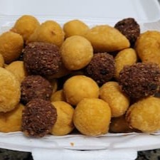 Kibe, bolinha de queijo, queijo e presunto, coxinha e enroladinho de salsicha.