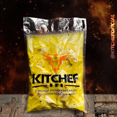 1KG DE CONTRA FILÉ / 1KG DE LINGUIÇA SUÍNA / 1KG DE DRUMET TEMPERADO AO MOLHO DE MOSTARDA / PÃO DE ALHO / MOLHO BARBCUE / SAL GROSSO / FAROFA / CARVÃO / ACENDEDOR