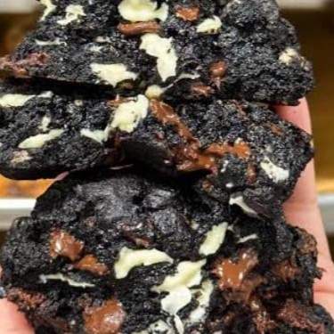 Cookie feito com nossa massa estilo New York black, que leve cacau black na sua receita, crocante por fora e macia pr dentro e com muitaaaaas gotas de chocolate nobre branco e chocolate nobre meio amargo!