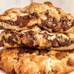 Cookie feito com massa estilo New york, crocante por fora e macia por dentro, com muitaaaas gotas de chocolate ao leite e chocolate branco e recheio cremoso de Kit Kat!
