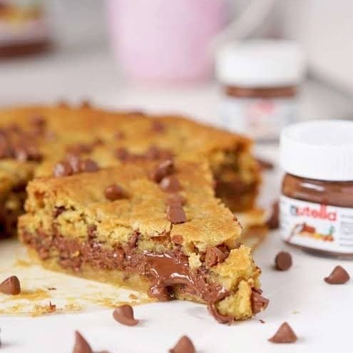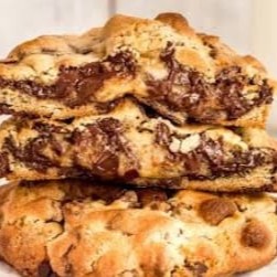Nossa torta feita com massa de cookie tradicional de baunilha, mix de gotinhas de chocolate meio amargo e chocolate ao leite, suuuper recheada com Nutella!
