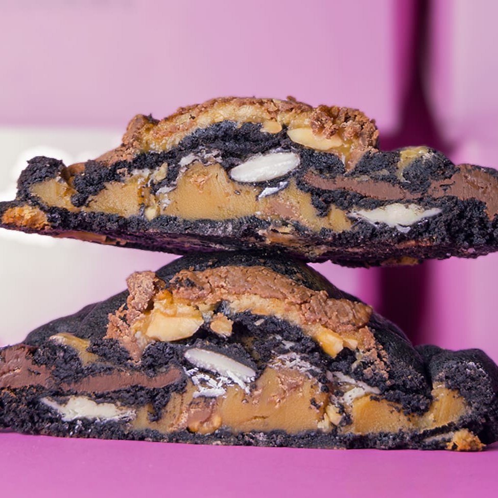 Cookie feito com nossa massa black, feita com cacau black, muitaaaaa gotas de chocolate branco nobre e chocolate nobre meik amargo recheado com snikers e doce de leite!