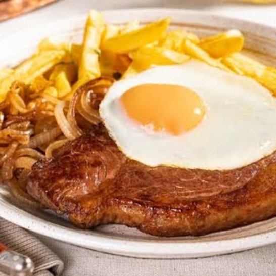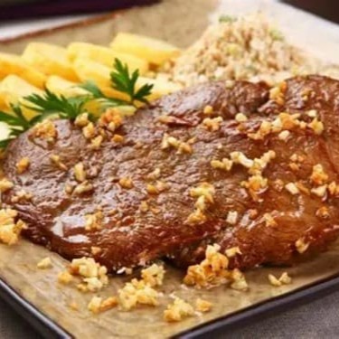 Bife de contra Filé bem suculento com alho torrado por cima Obs: escolher como prefere o bife,ao ponto,bem passado ou mal passado.