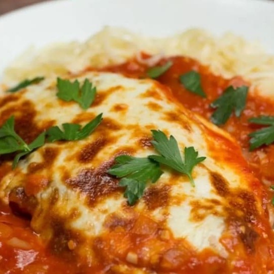 Um delicioso frango à parmegiana com molho vermelho, bastante queijo