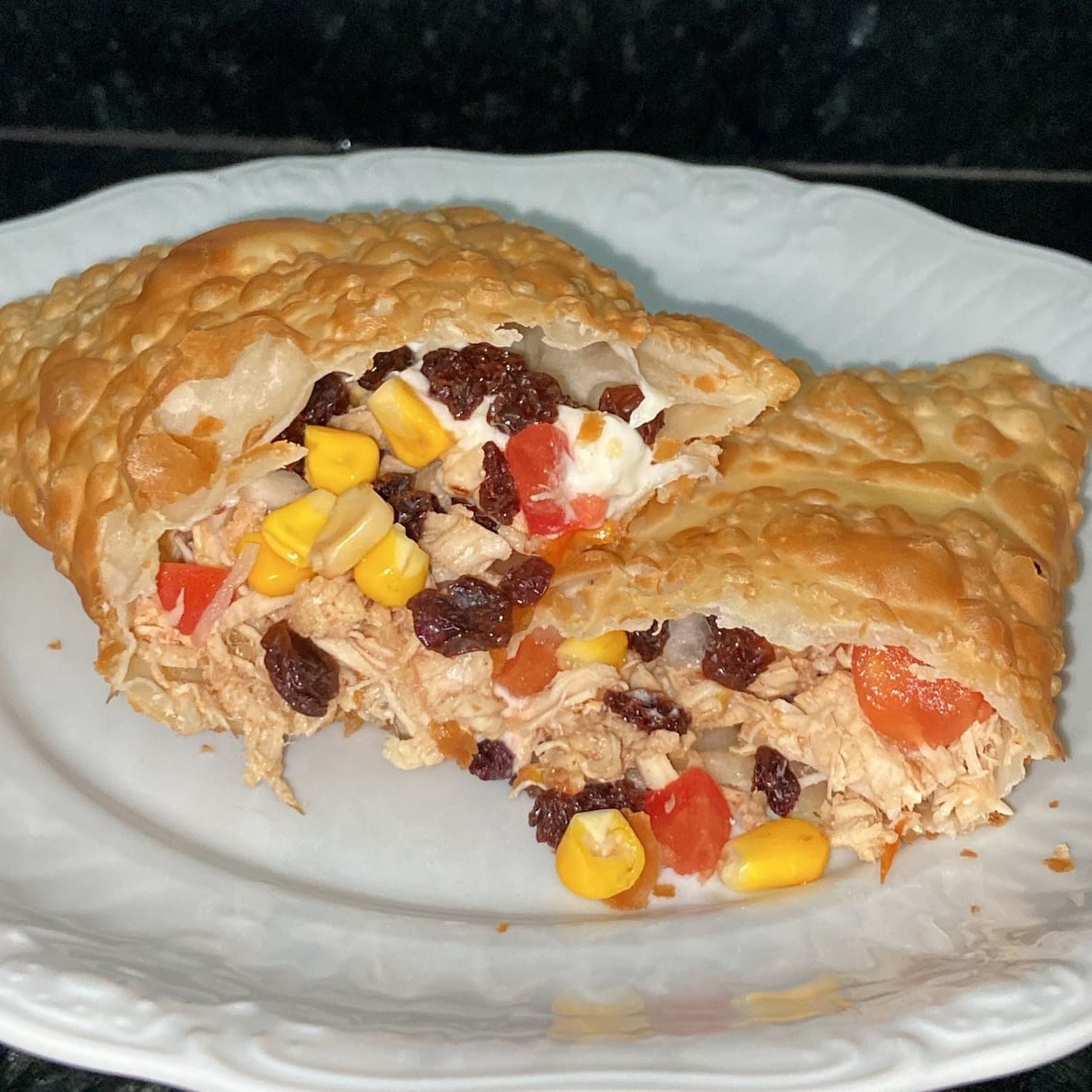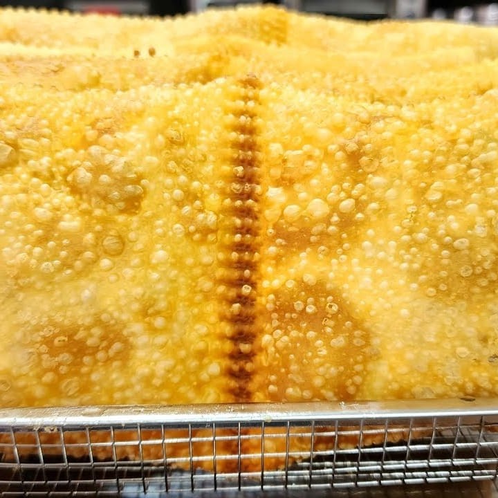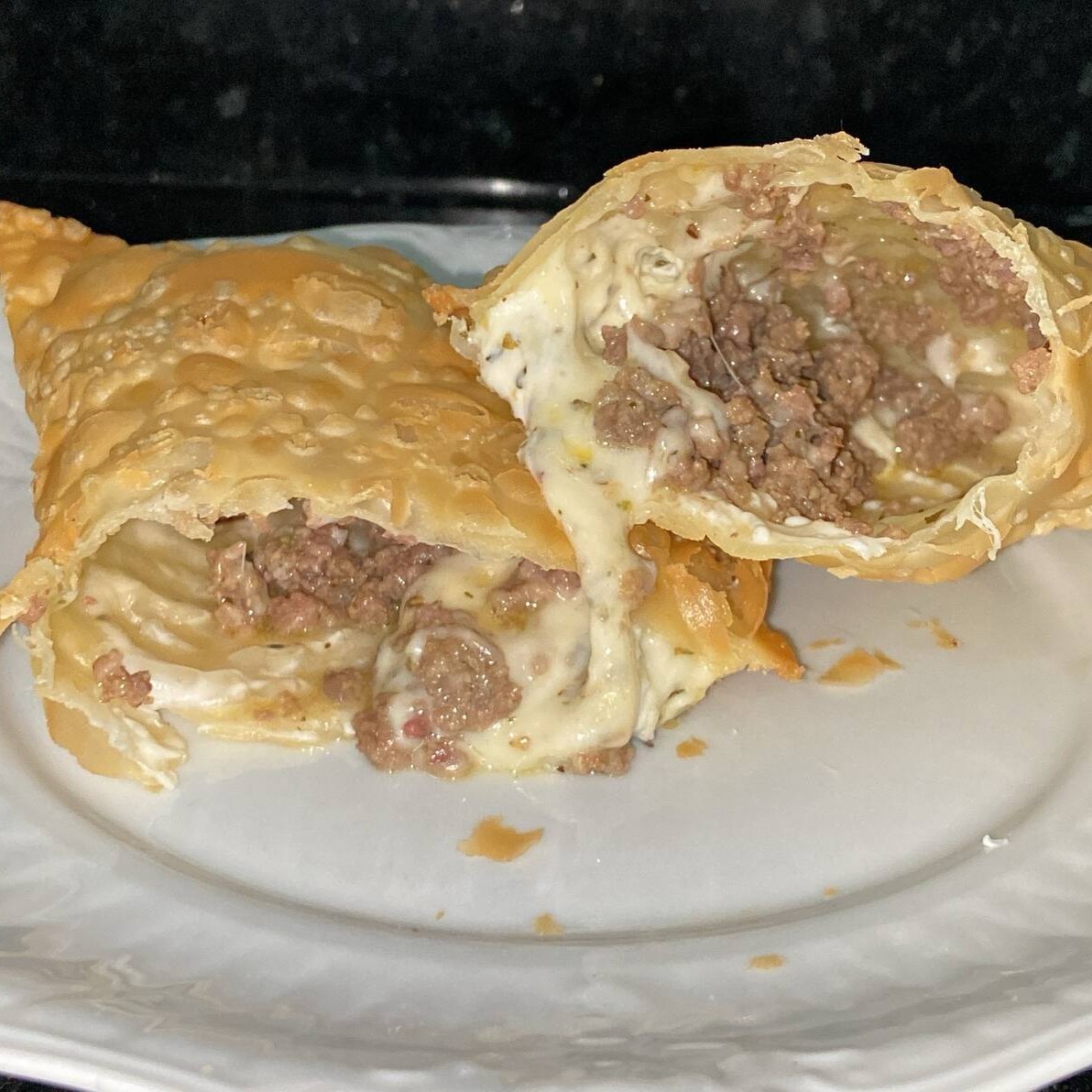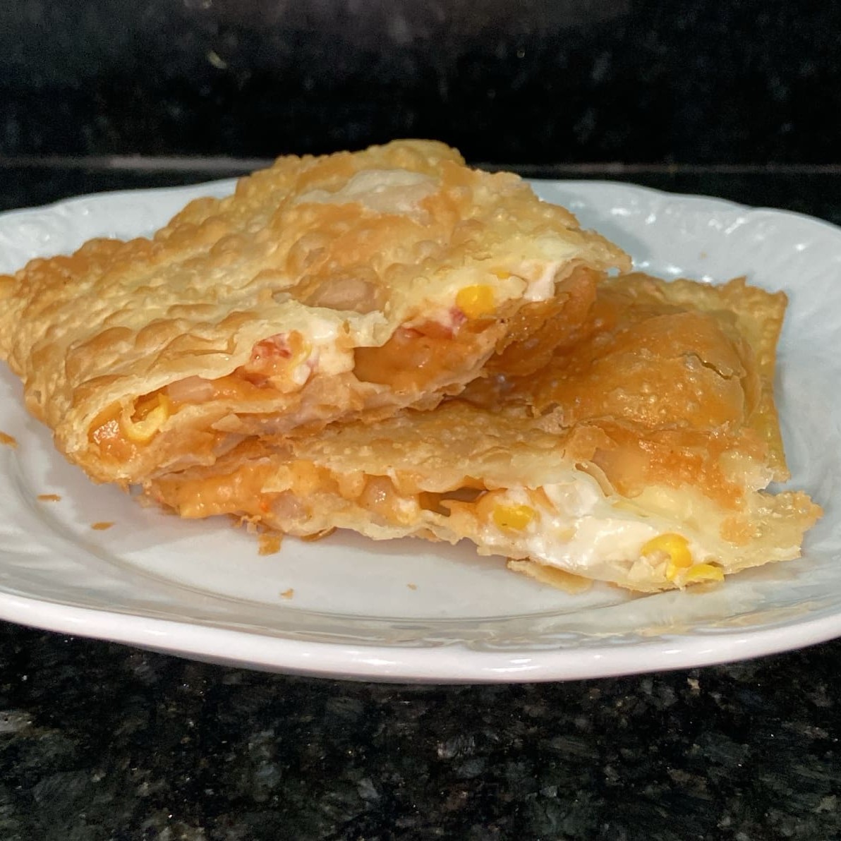 Suculento pastel recheado com queijo muçarela, bacon em cubos e ovo.