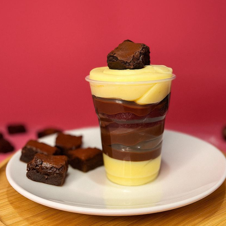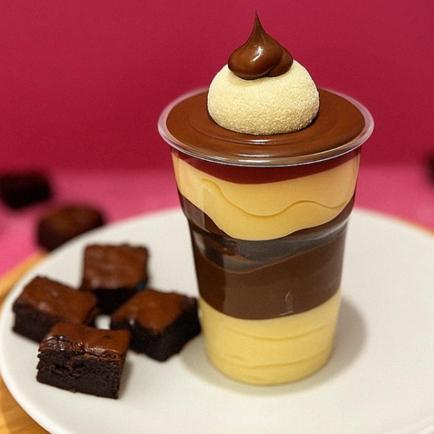 copo da felicidade- chocolate, ninho & brownie uma delicia cremosa com camadas de chocolate e leite ninho, pedaços de brownie macio. sobremesa perfeita