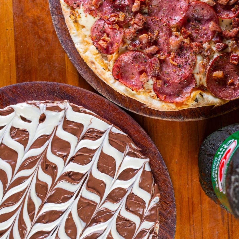 Combo especial: Delicie-se com a nossa irresistível pizza grande de 35cm, perfeita para compartilhar, acompanhada da deliciosa pizza doce de 25cm. Uma combinação perfeita para uma refeição deliciosa e completa!