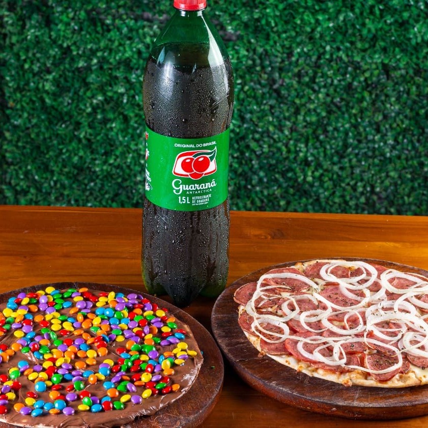 Compre uma de uma pizza de 35cm nos sabores tradicionais com um refrigerante 1,5l Guaraná e garanta sua pizza doce brotinho 20cm totalmente grátis