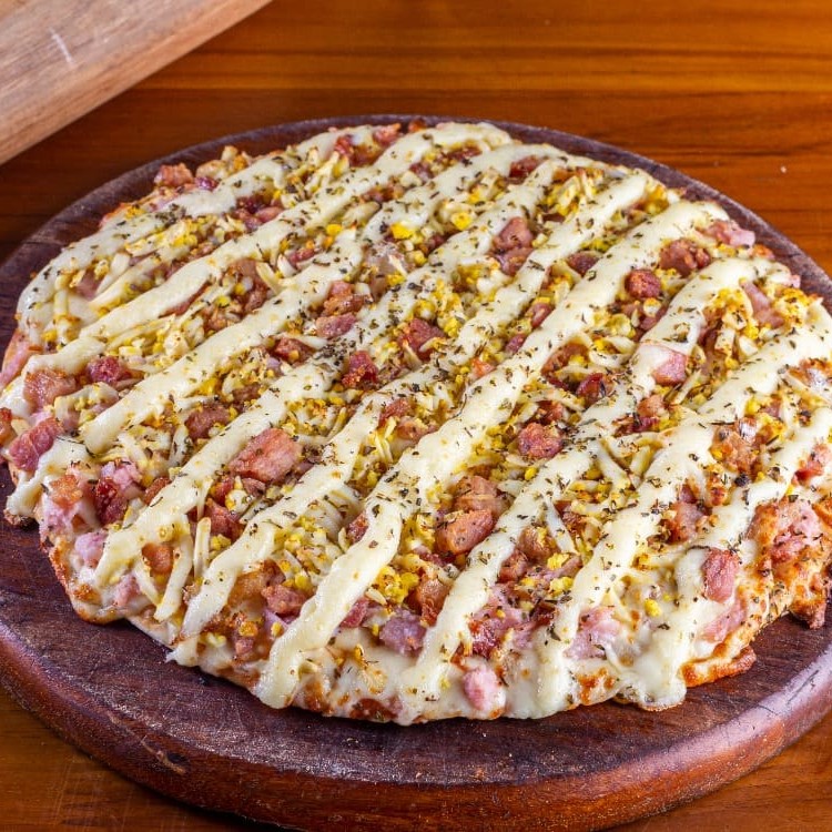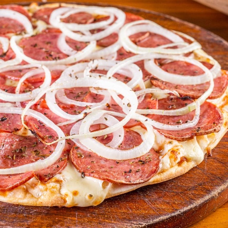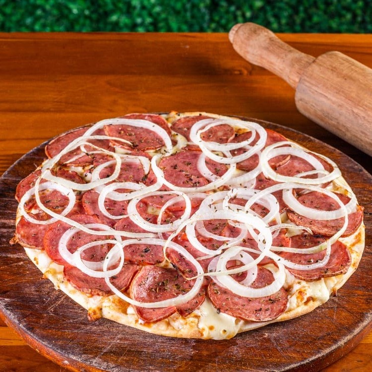 Massa fininha, molho de tomate artesanal, muçarela da melhor qualidade, calabresa, cebola e orégano