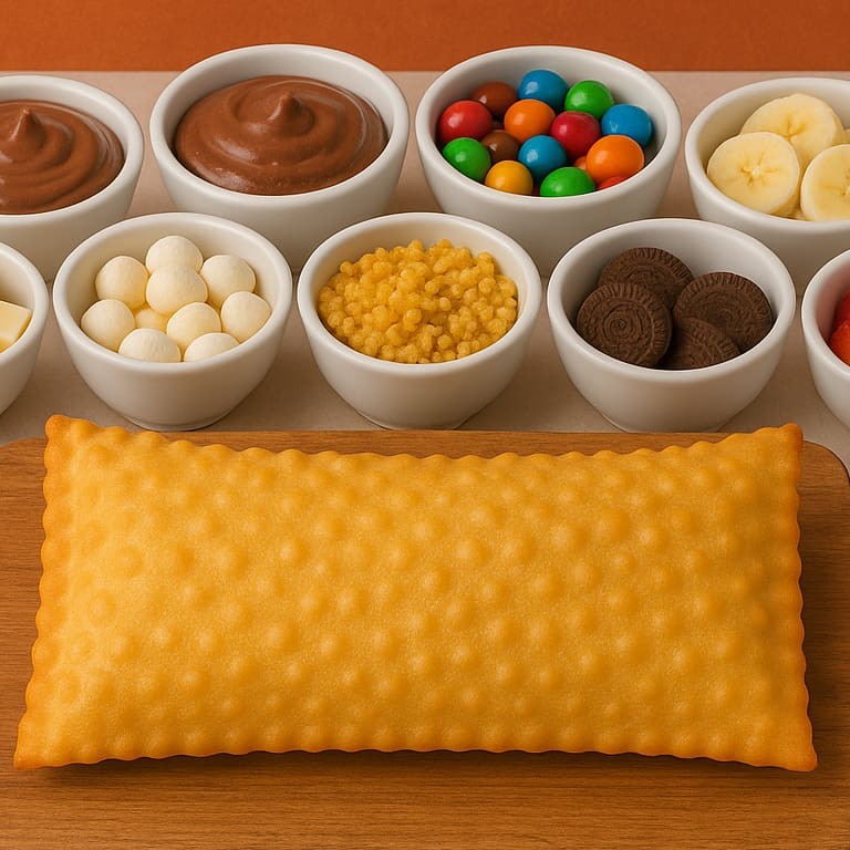 Aqui quem manda é você! Escolha seus recheios favoritos e crie o pastel doce. Tem chocolate, Nutella, morango, banana, marshmallow, confetes, chocoball e muito mais! Tudo isso dentro de uma massa crocante e quentinha de 20 cm. Combinações malucas ou clássicas? Você decide!