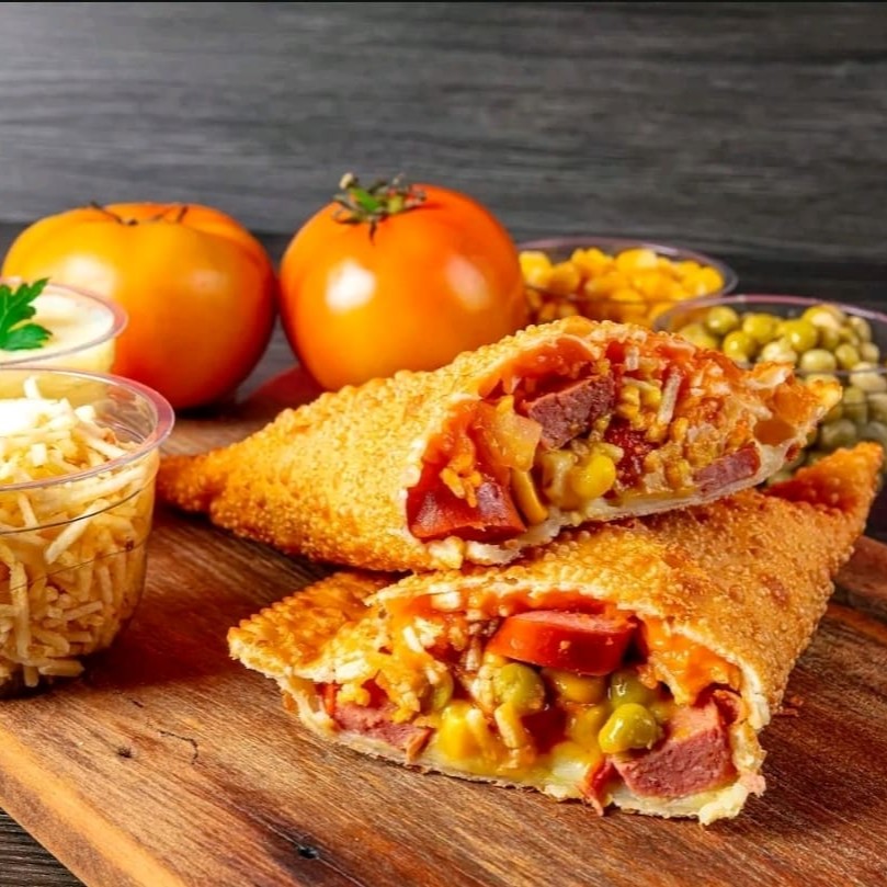 Experimente nosso delicioso pastel de cachorro-quente! Feito com salsicha, a crocância da batata palha, o milho e o toque das ervilhas, tudo envolto em uma massa leve e dourada.
