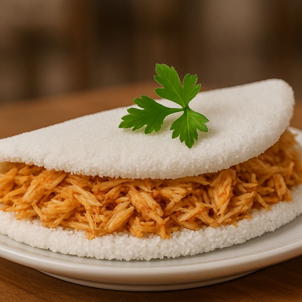 Tapioca macia e fresquinha recheada com frango desfiado temperado na medida certa, trazendo sabor e suculência a cada mordida. Uma opção leve, nutritiva e deliciosa para qualquer hora do Dia. Personalize com queijos, milho, Catupiry e outros complementos para deixar do seu jeito! Imagem meramente ilustrativa!