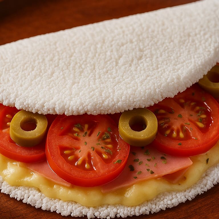 Em uma fusão irresistível nossa tapioca de pizza traz uma massa leve e macia, recheada com uma combinação suculenta de queijo derretido, presunto finamente triturado, fatias frescas de tomate, e azeitonas finalizada com um toque aromático de orégano. Uma escolha perfeita para quem busca praticidade sem abrir mão do sabor. Imagem meramente ilustrativa