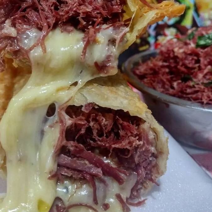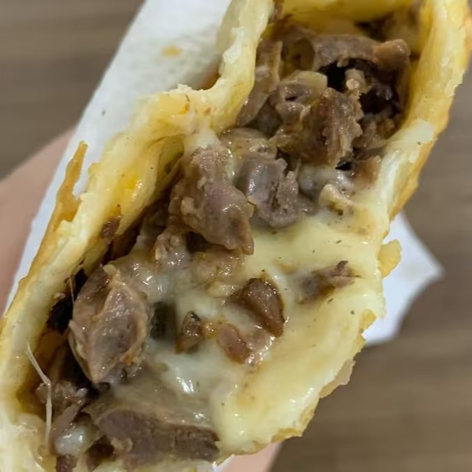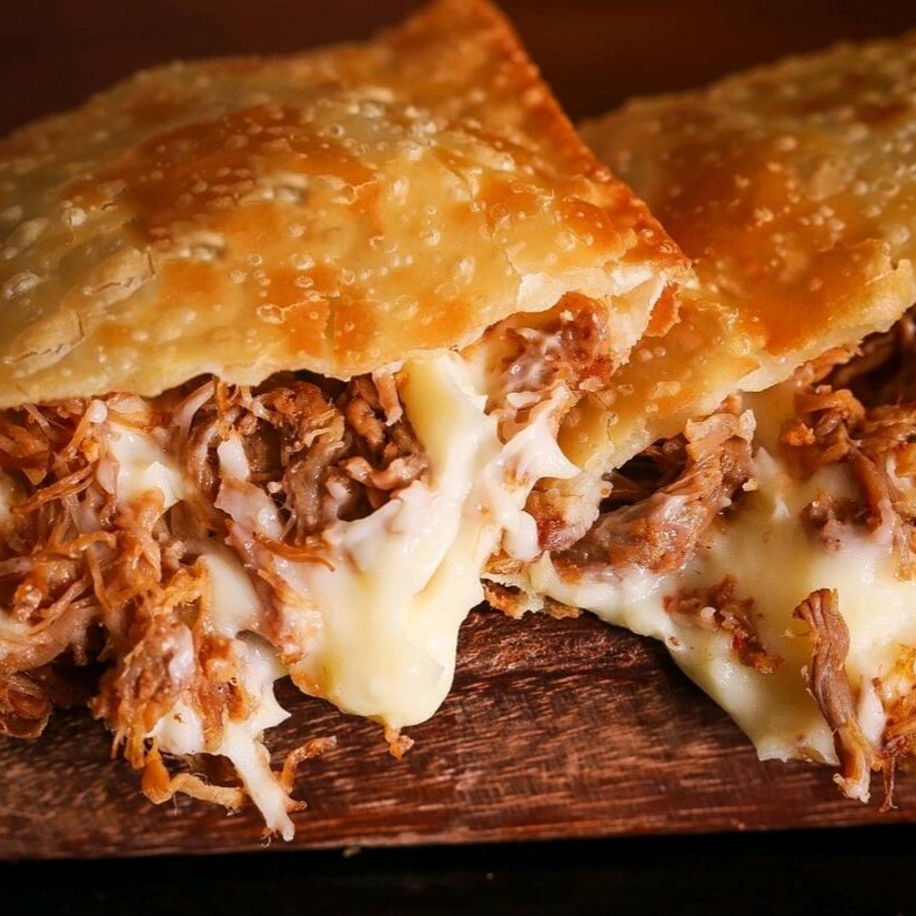 Deliciosa costela bovina muito bem temperada, desfiada com queijo mussarela