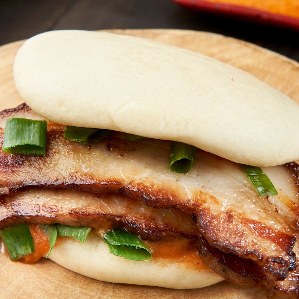 Pão cozido no vapor, molho barbecue tailandês, cebolinha e barriga de porco grelhada. 1 unid