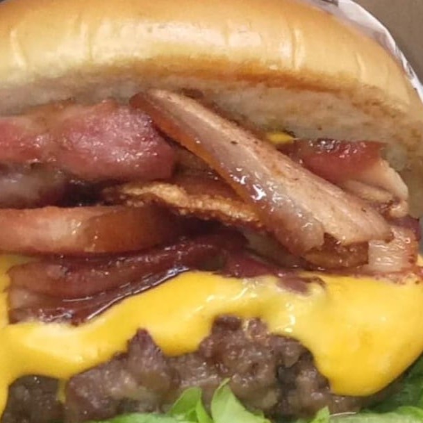 Pão Brioche, Carne Artesanal, Queijo Cheddar, Creme de Cheddar, Cebola no Shoyu, Salada e Molhos