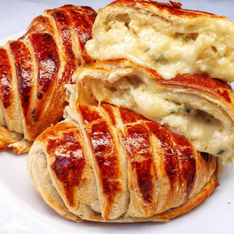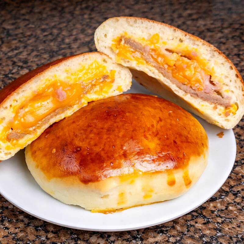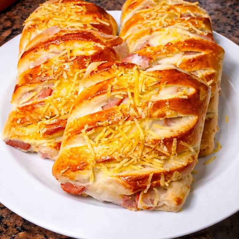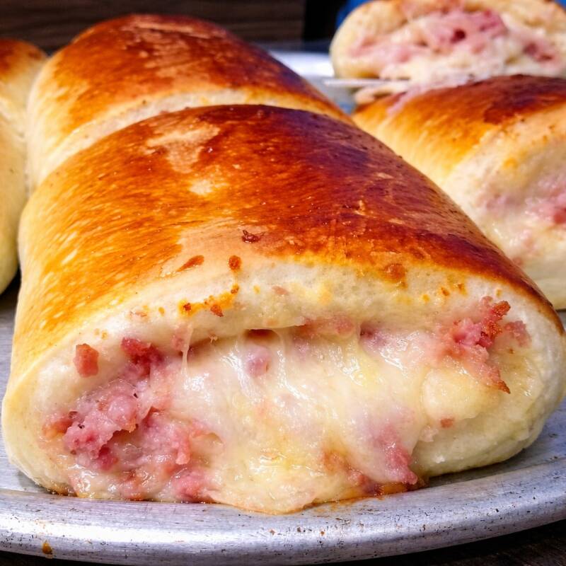 Joelho assado no forno, massa macia e dourada, recheado com queijo derretido e presunto selecionado. Perfeito para quem busca salgado assado saboroso para café da manhã ou lanche rápido.