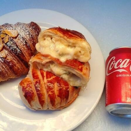 1 Croissant Salgado (frango Com Mussarela) + 1 Croissant Doce (chocolate) + Coca 1 Croissant Salgado (frango Com Mussarela) + 1 Croissant Doce (chocolate) + Coca