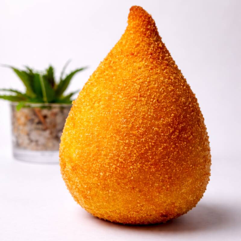 Coxinha de frango (150g) Refogada com cebola, alho, salsinha, e condimentos. Massa leve com aquela casquinha crocante ,recheio suculento.