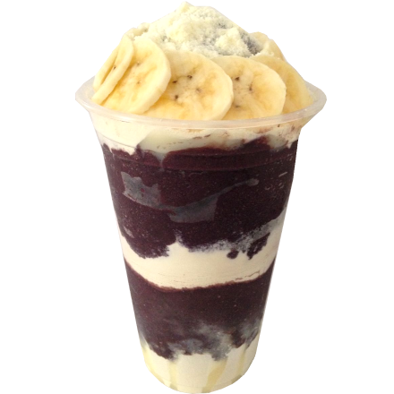 Açaí cremoso no sabor natural com muita banana, leite em pó e leite condesado.
