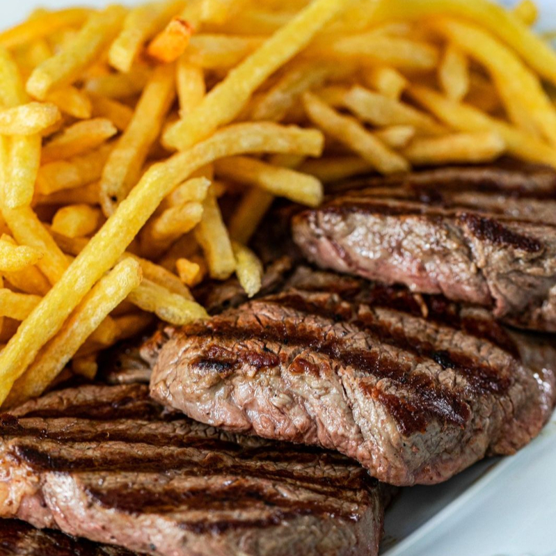 Suculento bife de contra filé grelhado, servido com batatas fritas douradas e crocantes. Uma combinação clássica e saborosa para matar sua fome com muito sabor!