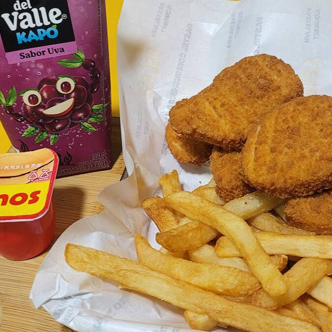 5 nuggets, batata frita, suco kapo ou guaravita e danoninho.