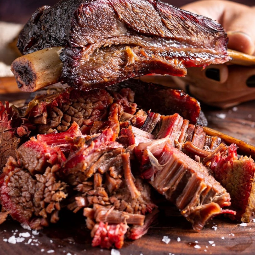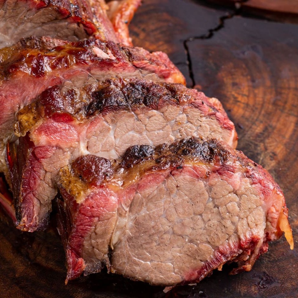Rainha da Casa. Costela bovina maturada cuidadosamente assada na lenha por 12 horas, resultando suculência e sabor defumado inigualável. Sem osso e sem excesso de gordura. (aprox.400g)