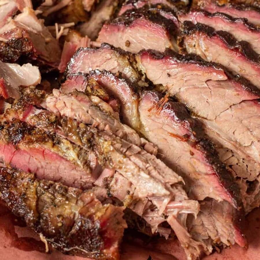 O Brisket é um corte extraído da maçã do peito bovino, é a estrela da nossa refeição. Suculento e defumado, é o corte mais famoso nos Estados Unidos. É servida com arroz branco, batata frita, farofa crocante de costelinha defumada e vinagrete.