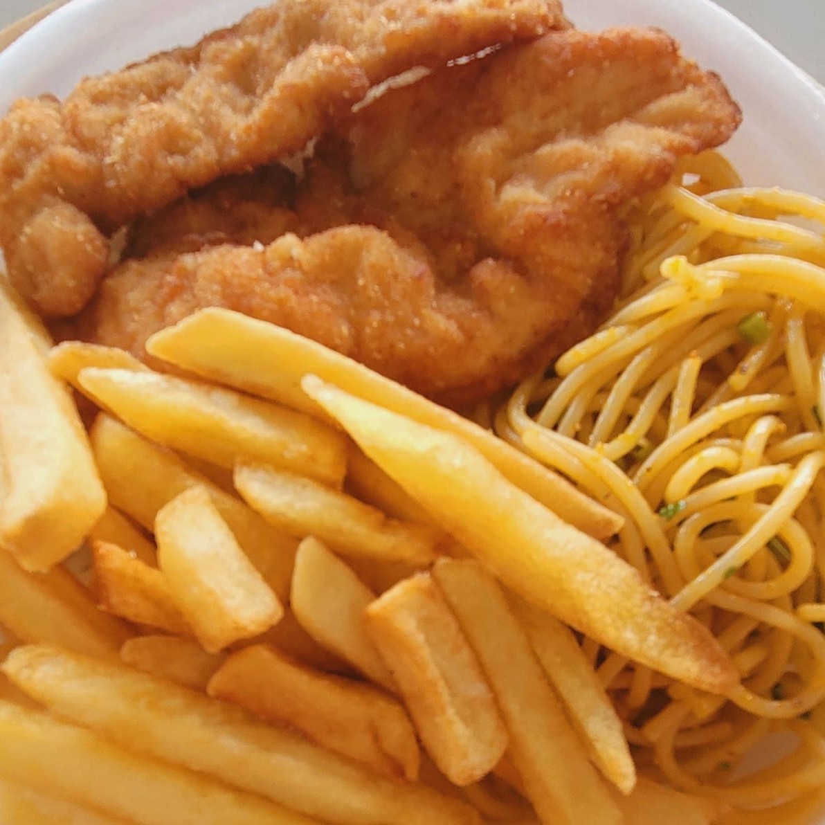 Delicioso frango à milanesa acompanha, arroz, feijão, macarrão, farofa da casa e batata frita aprox 500g