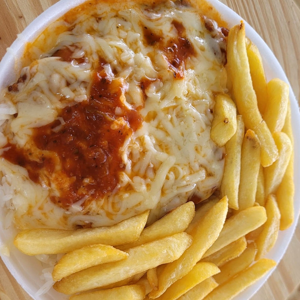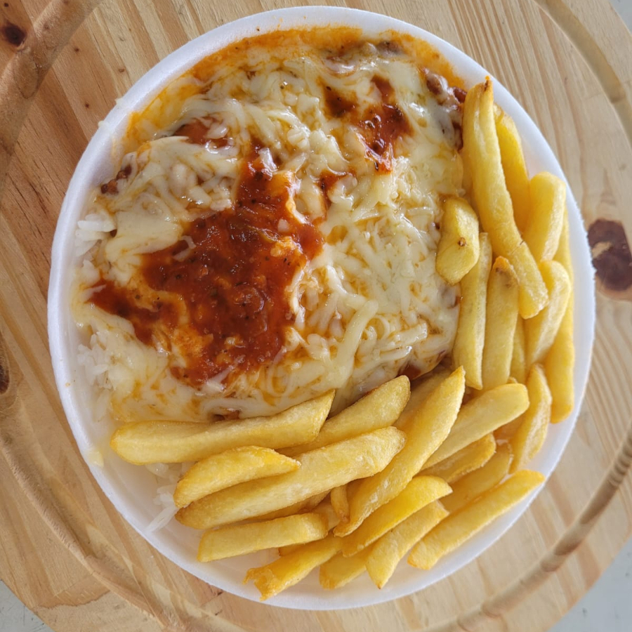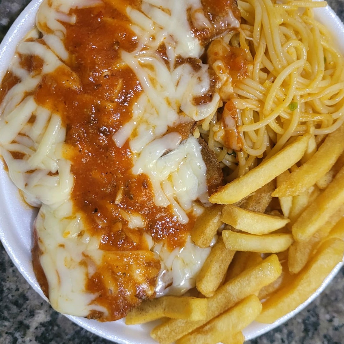 Deliciosa berinjela parmegiana acompanha, arrozz feijão, macarrão, farofa da casa e batata frita aprox:500g