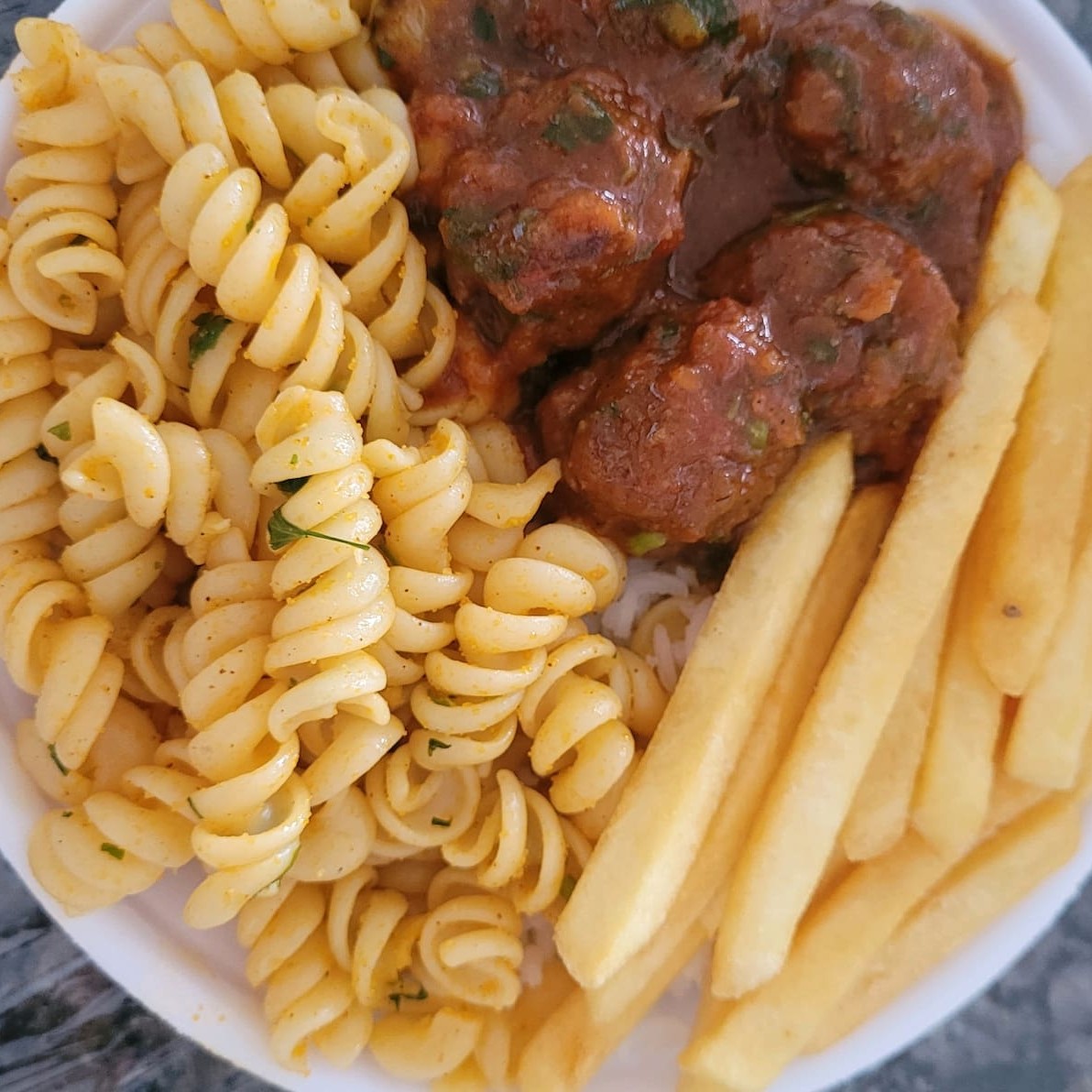 Deliciosa Almôndega de carne moída acompanha, arroz, feijão, macarrão, farofa da casa e batata frita aprox:500g