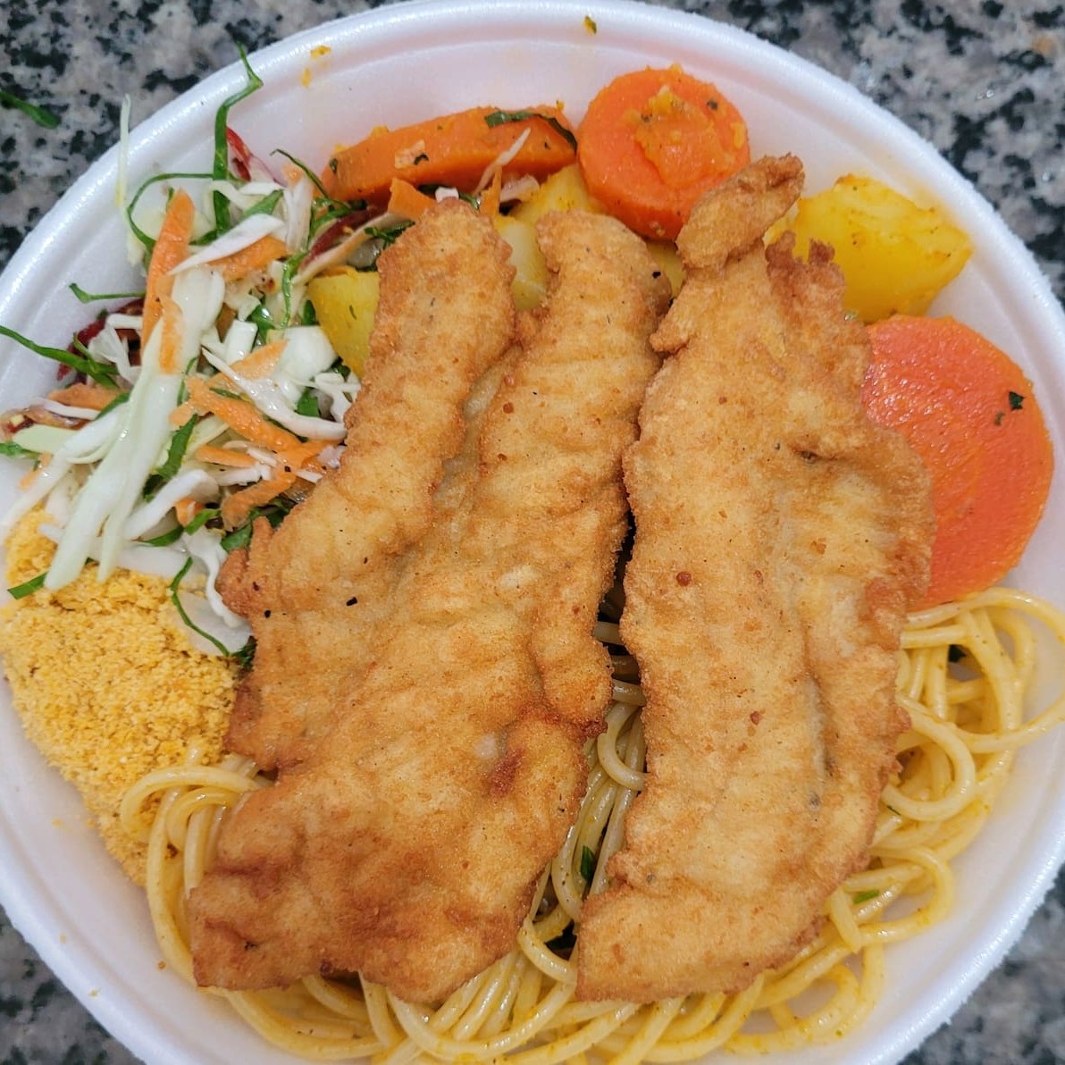 Delicioso Filé de peixe á milanesa acompanha, arroz, feijão, batata frita e farofa da casa aprox:500g