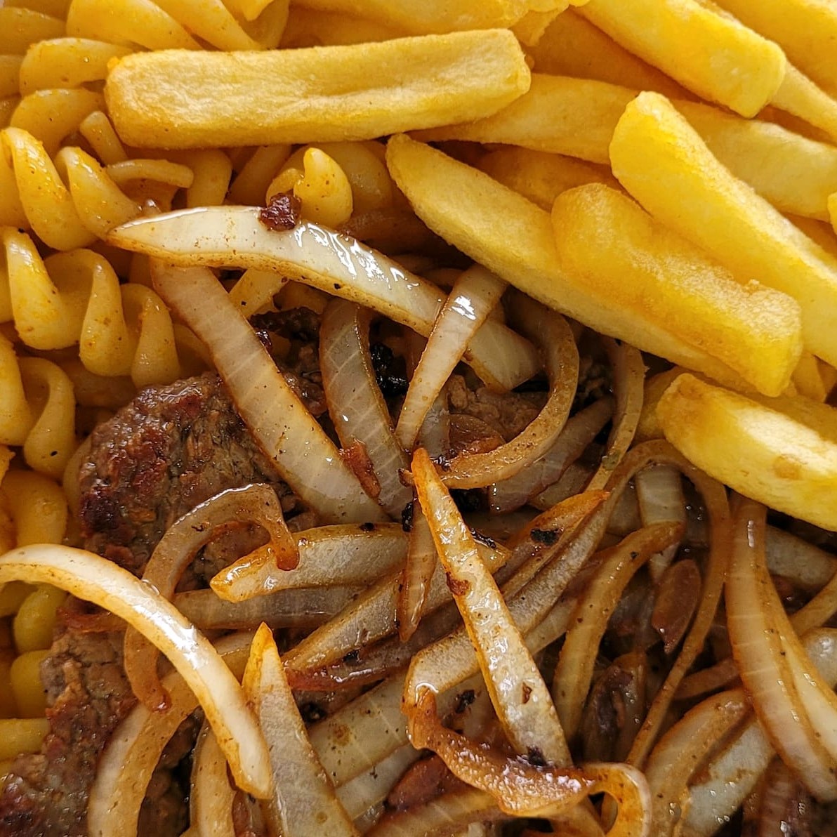 Delicioso bife de alcatra acebolada acompanha, arroz, feijão, macarrão, batata frita e farofa da casa aprox:500g