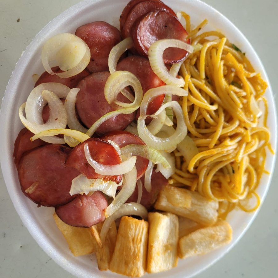Linguiça Calabresa Acebolada, acompanha arroz, feijão e batata frita aprox:500g