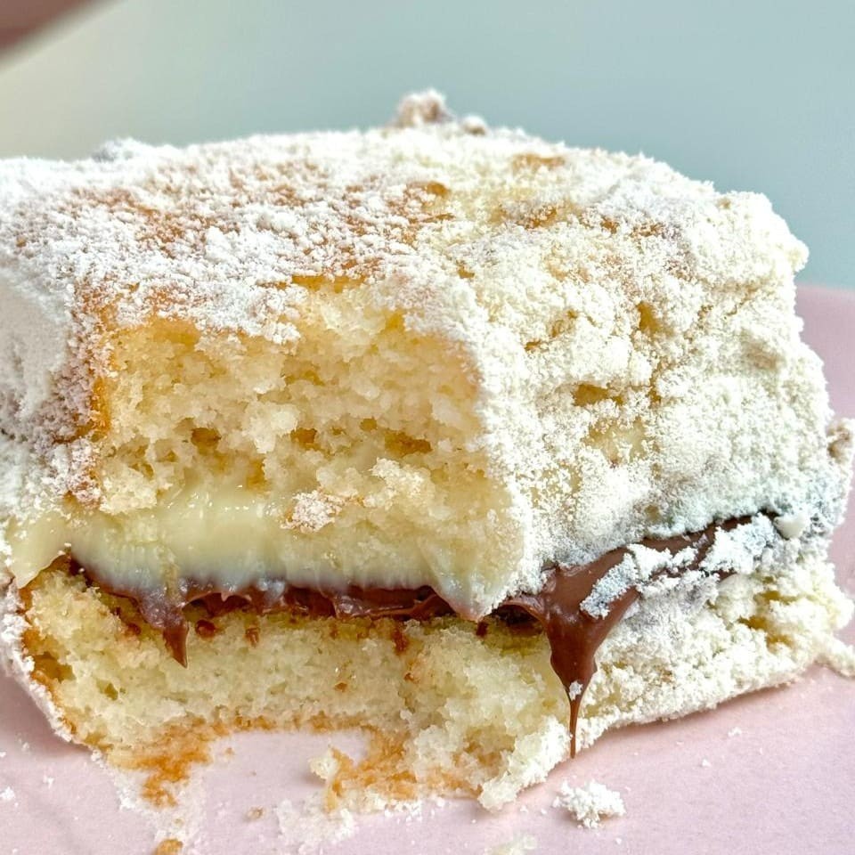 Massa de baunilha bem molhadinha, com um delicioso recheio cremoso de Ninho com Nutella.