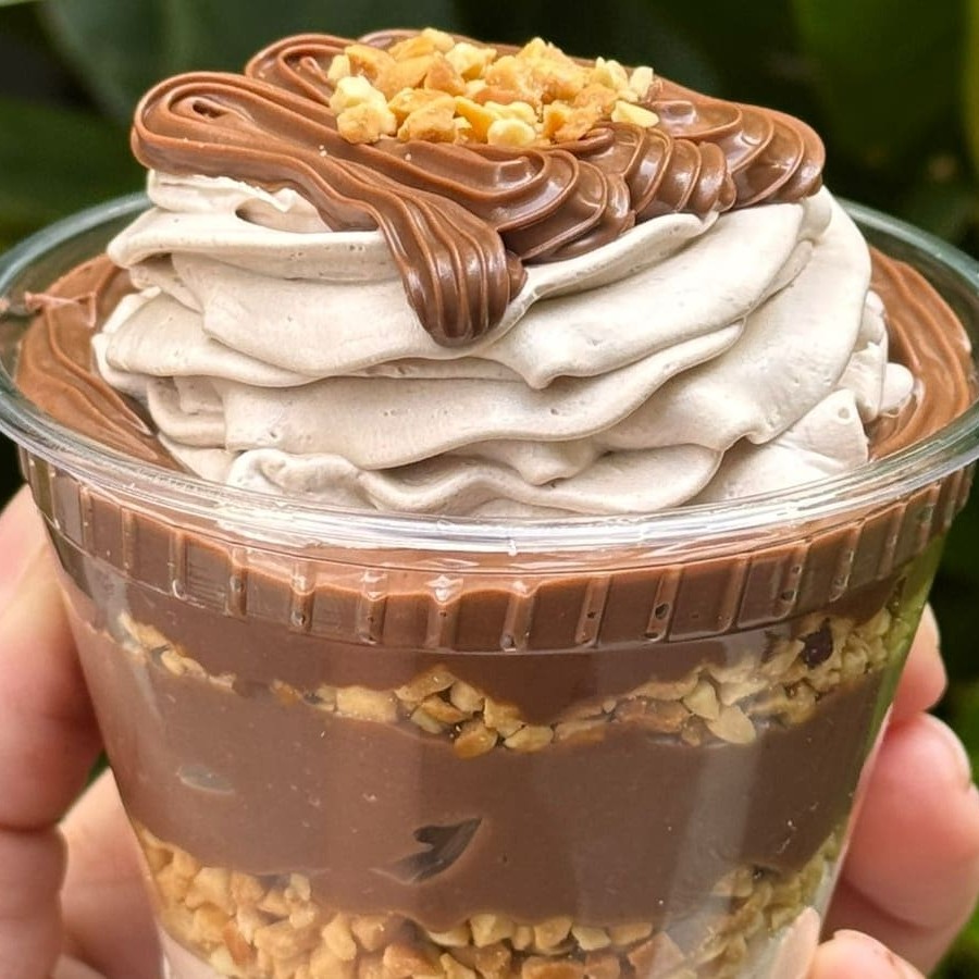 Com mousse de chocolate (chantilly), amendoim, brigadeiro cremoso e Nutella