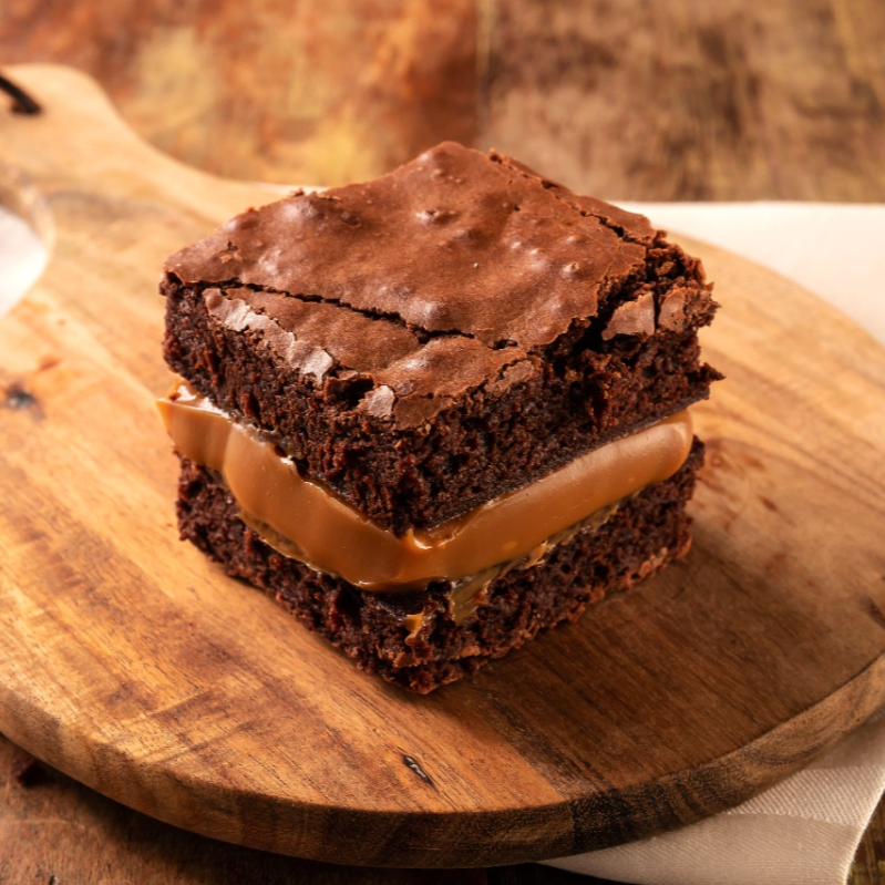 Brownie coberto com brigadeiro de leite Ninho finalizado com Nutella.