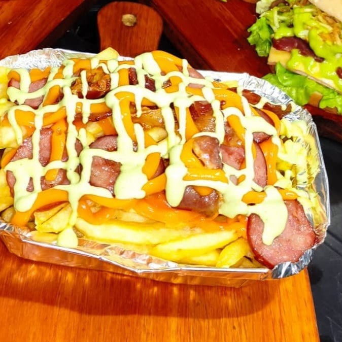batata frita , bacon , calabresa , cheddar , ketchup e molho verde