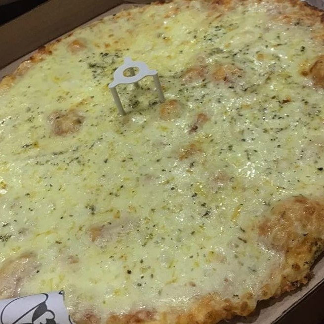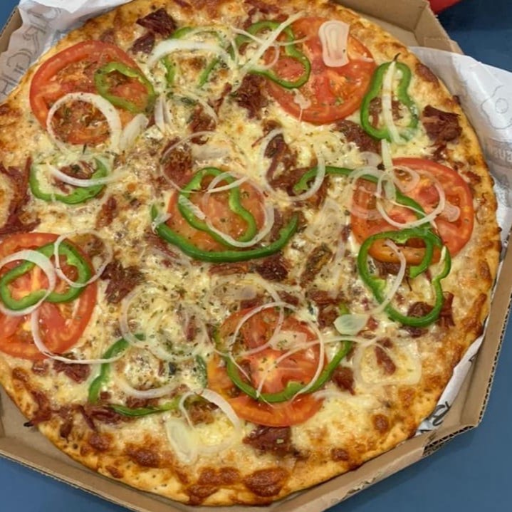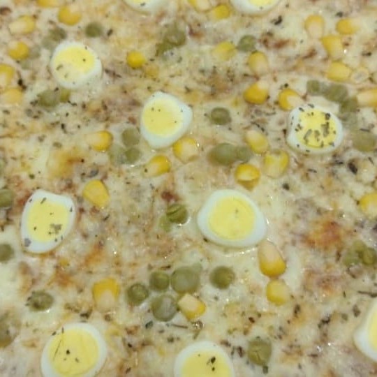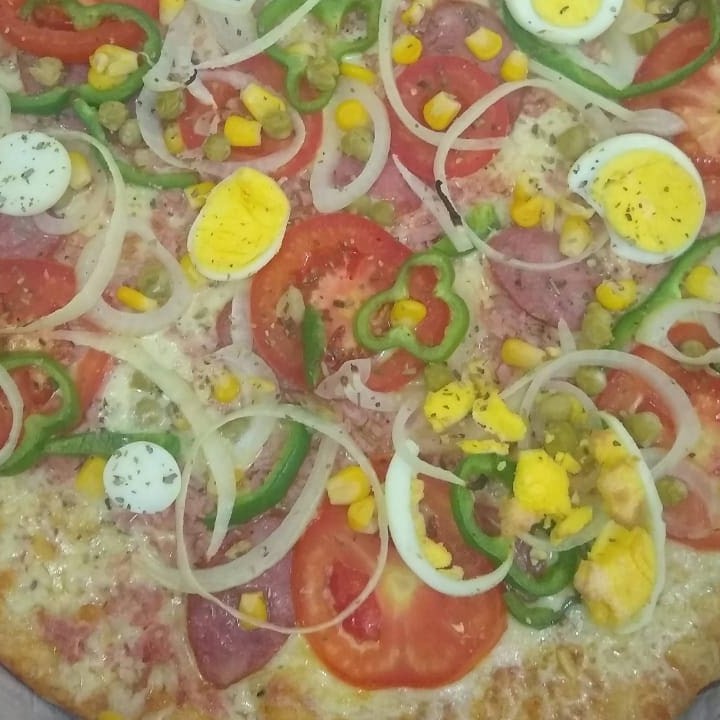 Mussarella, Milho, ervilha, cebola, calabresa, presunto, tomate, pimentão, ovo e oregano.