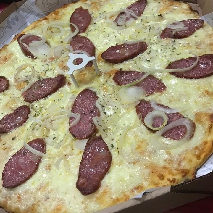 Mussarela, linguiça calabresa, cebola e oregano.
