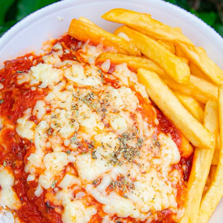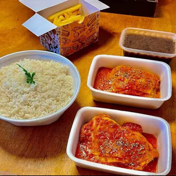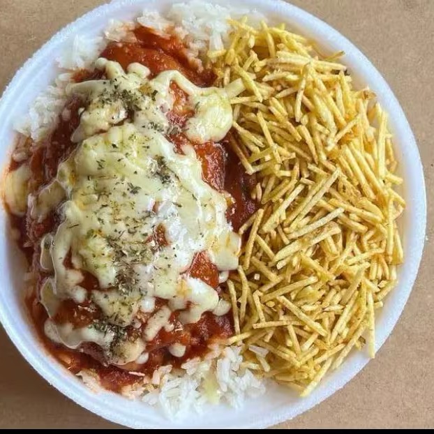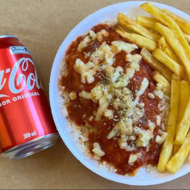 Filé de frango, massa crocante, molho de tomates, queijo mussarela, arroz branco, batatas fritas e feijão.
